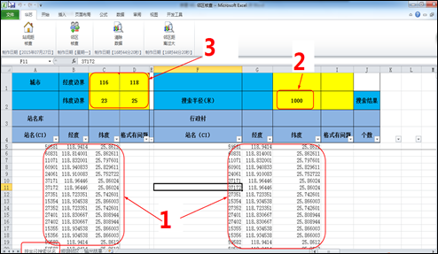 a、數據粘貼完成及手動設置半徑后,點擊圖5中的1【站間距核查】,等待一會兒輸出結果如圖5中的2,其中2有個別單元格的顏色為紅色,表示該站點與同行的F列中的站點共站,無填充顏色的單元格表示該站點與同行F列中的站點在設置的半徑范圍內;