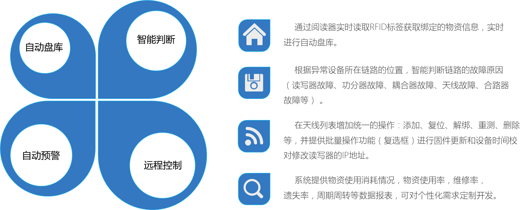 自動盤庫:通過RFID標(biāo)簽信息讀取,自動識別和盤點室分資產(chǎn),實現(xiàn)室分資產(chǎn)無人化盤點,提高資產(chǎn)盤點效率。