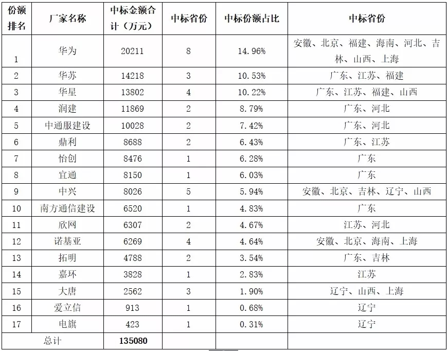 2018年3月5日,驚蟄,一個足以載入通信網優史冊的日子,這一天印證了羅振宇在時間的故事里分享的“大者恒大,強者恒強”的預言,在全國首輪11個省份涉及44.63億元的網優集中采購招標盛筵中,華蘇一舉斬獲江蘇第1份額,福建第1份額和廣東第4份額(簡稱114),整體份額僅次于華為。