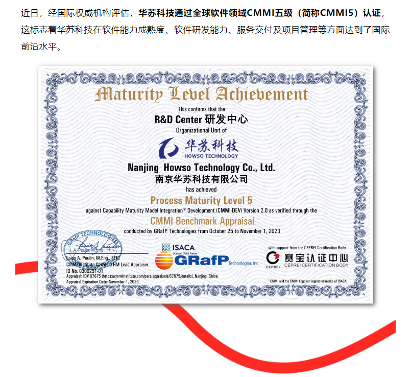 這標志著華蘇科技在軟件能力成熟度、軟件研發能力、服務交付及項目管理等方面達到了國際前沿水平。