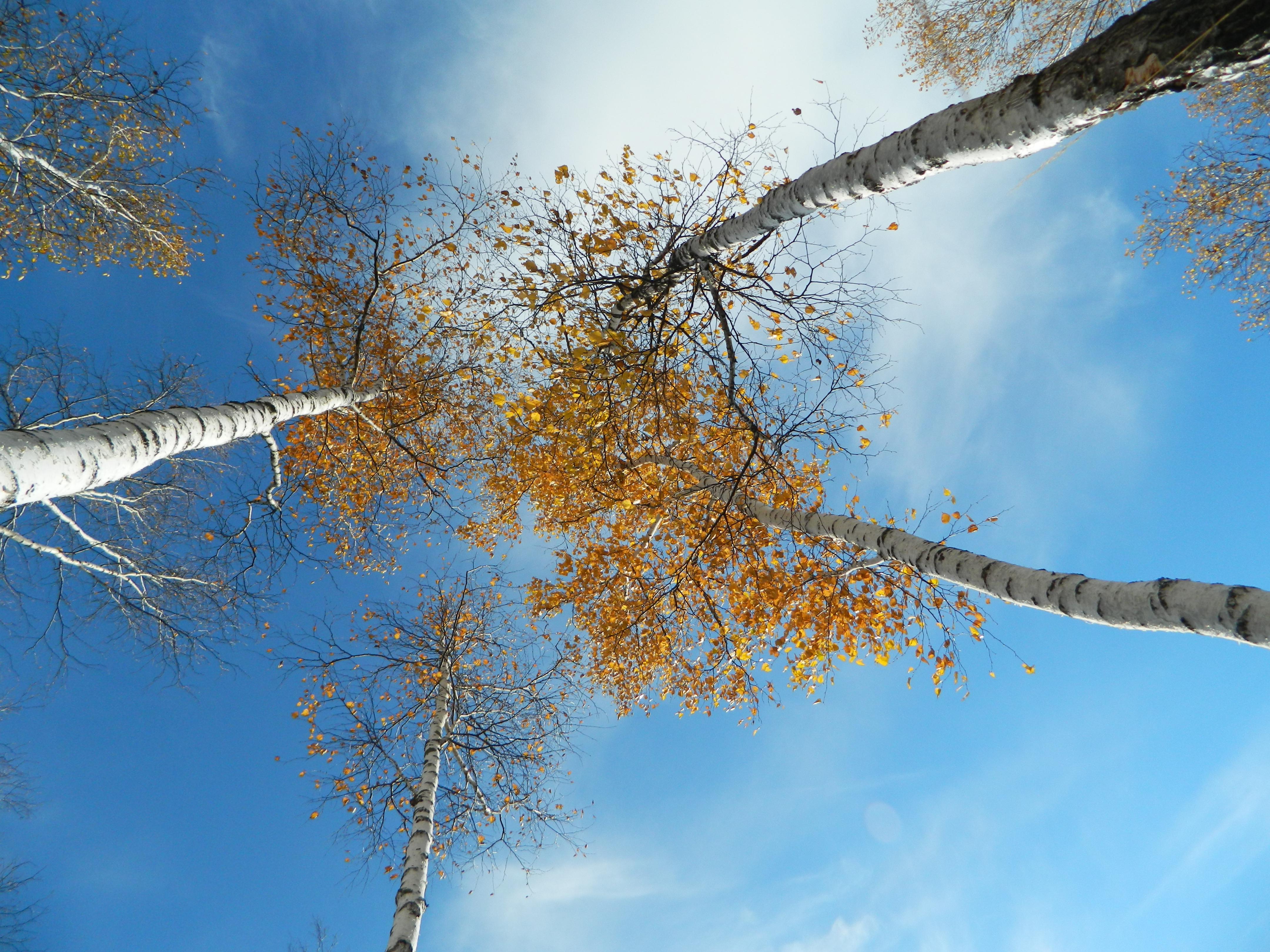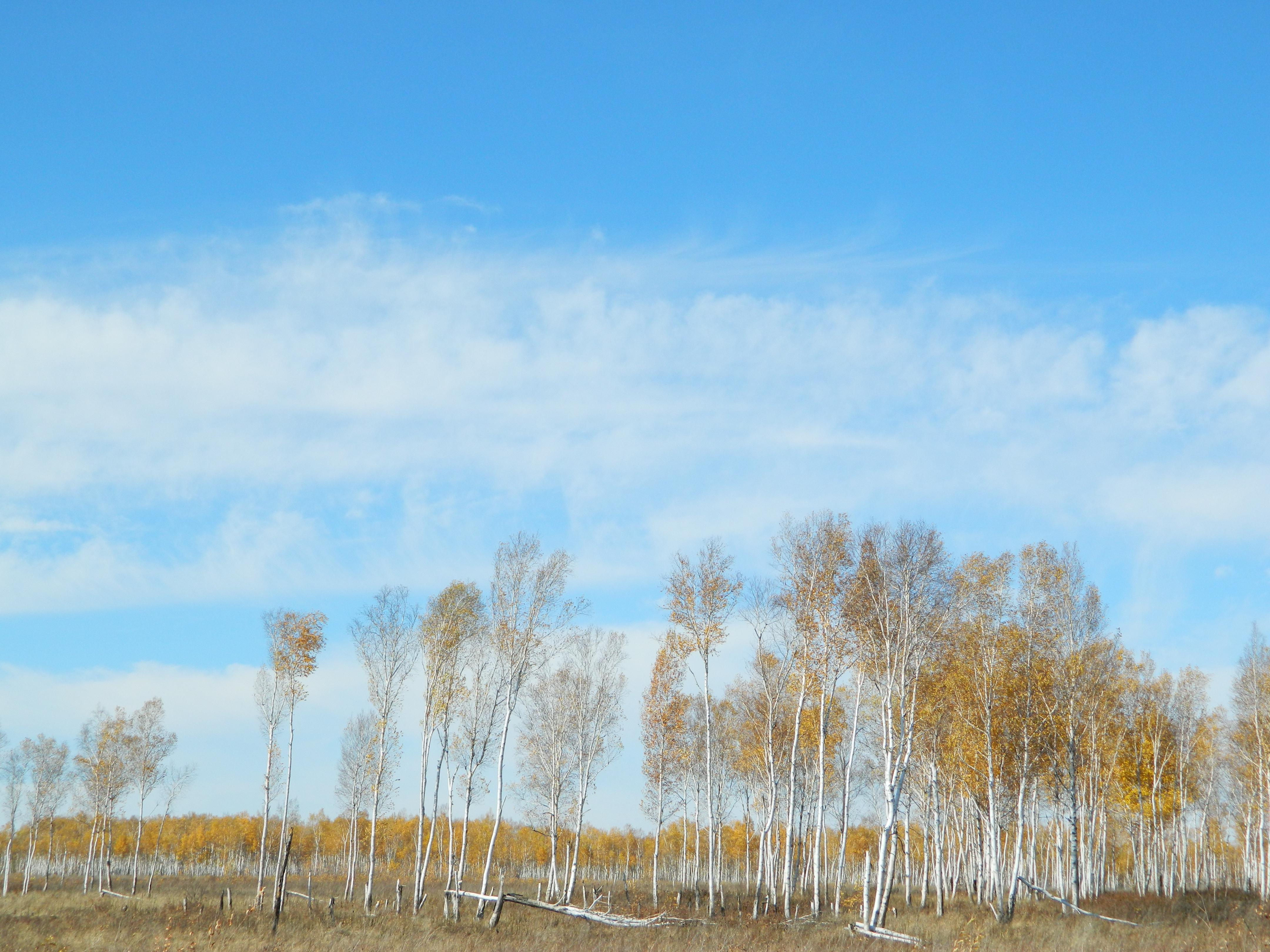 白樺林為東北鄰區(qū)具有代表性的樹種,她的白色與藍(lán)色的天空、白云交相輝映,描繪出秋天的色彩。